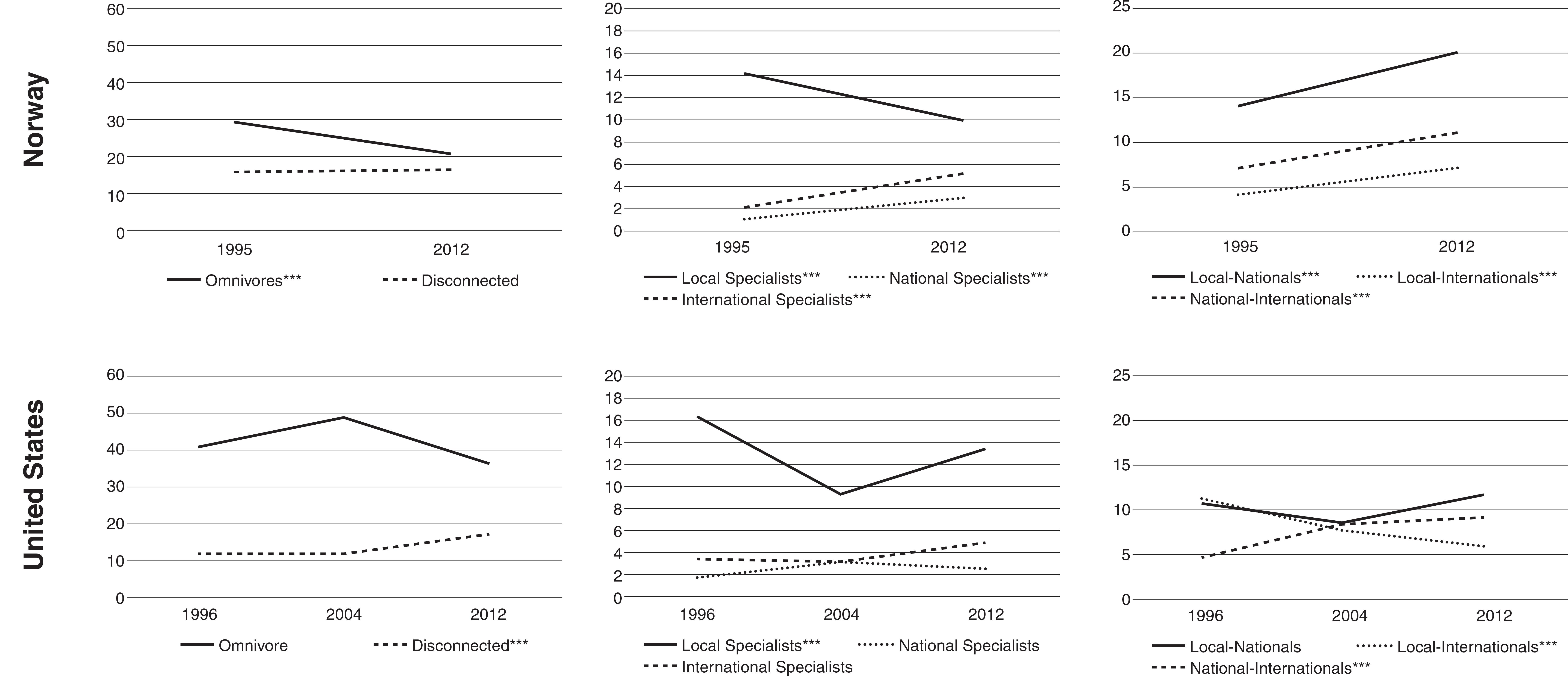 To compare patterns of news orientation in the United States and Norway, we use survey data collected by the Pew Research Center (U.S.) and TNS Gallup (Norway). These data-sets include observations covering the same time period (1995/1996 to 2012) and they include similar variables that measure individuals’ self-reported interest in (Norway) and attention to (U.S.) local, national and international news. Due to differences in question phrasing, these data are not directly comparable and we do not focus on comparing the proportion or number of news omnivores, disconnects and specialists