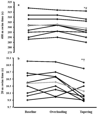Individual performance time for (a) 400 m swim and (b) 20 m swim at baseline and at the end of overloading and tapering training phases. Τhe grey line represents mean values for each testing period (n = 8). *: p ≤ 0.05 between tapering and baseline,